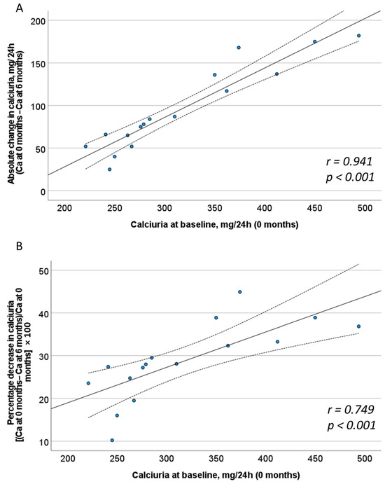 Correlation between absolute change (A) and percentage decrease (B) in calciuria after treatment with calcium magnesium phytate (InsP6) with calciuria at baseline. The solid line is the line best fit. The dotted lines are its 95% confidence bands. Pearson correlation coefficient and p-value are indicated in the lower right corner.