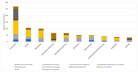 Vancomycin, colistin, and meropenem were the most frequently intervened medications in the present research. These antimicrobials have complex dosing requirements and necessitate individualized therapy and close monitoring by clinical pharmacists [,]. The complexity of their pharmacokinetics and pharmacodynamics, coupled with the emergence of multidrug-resistant organisms, calls for customized dosing and vigilant monitoring. Additionally, acutely and critically ill patients often experience altered renal and/or hepatic functions, which necessitate individualized management to achieve optimal efficacy while minimizing adverse effects. Sepsis is the most common cause of acute kidney injury [], with reported incidences ranging between 30% and 60% in intensive care patients []. Furthermore, higher doses or combinations of antimicrobials are typically needed to address antimicrobial resistance [,]. These factors collectively underscore the importance of appropriate dose or frequency adjustments. Due to their narrow therapeutic index, vancomycin and colistin necessitate meticulous monitoring and adjustments to ensure efficacy while preventing toxicity, such as nephrotoxicity [,]. Most interventions involving these antimicrobials fall under the category of TDM. Other studies have highlighted the significant impact of pharmacist-led TDM programs in enhancing medication safety and patient outcomes in critical care settings []. However, the most common intervention with ceftriaxone is medication discontinuation, possibly due to inappropriate use, aligning with other studies suggesting that over half of ceftriaxone prescriptions are inappropriate [,].