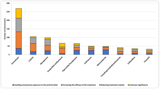 Antibacterial agents were the most frequently used drug class (87.3%), followed by antifungals (5.9%) and antivirals (4.9%) (Table 2). Dose or frequency adjustments and discontinuation of medications were the most common interventions among antibacterial agents, with 37.1% and 23.8%, respectively (Supplementary Table S1). Vancomycin had the highest number of interventions, with a percentage of 20.8%, followed by colistin (8.1%) and meropenem (7.6%) (Supplementary Table S4). Dose or frequency adjustment intervention was the most prevalent among vancomycin interventions (38.3%), colistin (50.5%), and meropenem (57.6%) (Figure 2). Therapeutic drug monitoring (TDM) intervention was mainly applied to vancomycin (25.7%) out of all vancomycin interventions (Figure 2). When it comes to drug subclasses and among antibacterial agents (n = 1130), more than half of the interventions were related to glycopeptides (23.4%), cephalosporins (13.6%), carbapenems (11.2%), and polypeptides (9.3%) (Supplementary Tables S2 and S3). At medication level, the majority of vancomycin interventions were aimed at increasing the efficacy of vancomycin therapy (36.1%) and reducing adverse effects and toxicities of vancomycin (29.4%) (Figure 3).