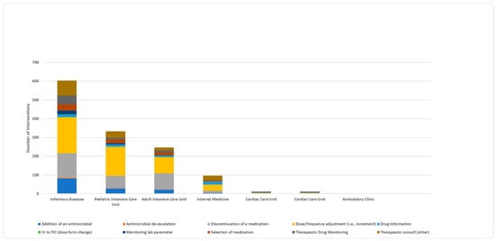 Frequencies and percentages were used to present the data. Crosstab analysis was used to identify differences in categorical variables. The Bonferroni–Holmes correction was used to keep a familywise error rate at 0.05 when there were multiple comparisons. When examining the relationship between clinical interventions and hospital units, the clinical intervention options were regrouped and renamed as follows: (1): “addition of an antimicrobial” and “selection of medication” were clumped into “select or add medication”; (2): “discontinuation of a medication” and “antimicrobial de-escalation” were clumped into “discontinue or de-escalate medication”; (3): “therapeutic consult” and “drug information” were clumped into “drug information”; and (4): “switching from IV to PO”, “TDM”, “dose or frequency adjustments”, and “monitoring lab parameter” were clumped into “dose modification and monitoring”. All statistical tests were two-sided. Differences were deemed statistically significant if the null hypothesis is rejected with greater than 95% certainty (p = 0.05).