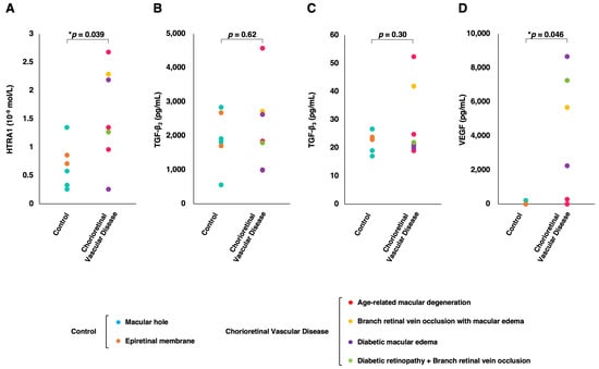 Chicago/Turabian StyleFukushima, Yoko, Shizuka Takahashi, Machiko Nakamura, Tatsuya Inoue, Yusuke Fujieda, Toshiyuki Sato, Shingo Noguchi, Motokazu Tsujikawa, Hirokazu Sakaguchi, and Kohji Nishida. 2024. "An Association between HTRA1 and TGF-β2 in the Vitreous Humor of Patients with Chorioretinal Vascular Diseases" Journal of Clinical Medicine 13, no. 17: 5073. https://doi.org/10.3390/jcm13175073