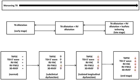 Natural history of TR. Red arrows indicate a worsening of the correspondent right ventricular echocardiographic parameter. TA: tricuspid annulus; TR: tricuspid regurgitation; RV: right ventricle; TAPSE: Tricuspid Annular Plane Systolic Excursion; TDI-S’ velocity: S’ of the tricuspid annulus at TDI; RV-FAC: RV Fractional Area Change; 3D-RVEF: three-dimensional right ventricular ejection fraction; RV-FWLS: right ventricle free wall longitudinal strain.