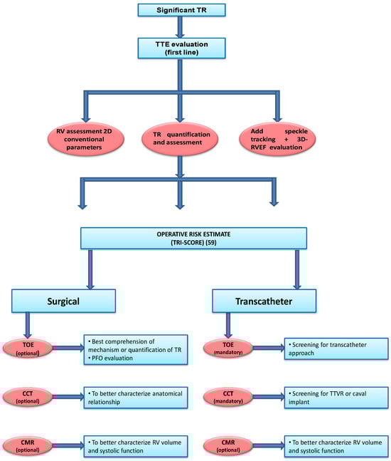 In echocardiography with conventional and non-conventional parameters, CCT and CMR both have strengths and weaknesses, so their use and combination depend on the different clinical scenarios []. Echocardiography represents the first imaging modality, especially in patients with severe TR, in whom TR quantification and mechanism identification are fundamental. In this setting, speckle tracking analysis and, if available, 3D echocardiography should be routinely used to account for load alterations connected to TR. CMR is the gold standard for volume and function assessment but is limited by availability, costs and the patient’s capability to perform the exam. The authors propose a personal and practical flow chart (Figure 2) for the use of multimodality imaging: if the patient may be a candidate for surgery, echocardiography with speckle tracking analysis and 3D may provide sufficient information for RV evaluation. If the imaging is suboptimal or discordant values are obtained, CMR should integrate RV dimensions and function assessment. If the patient is at high surgical risk and undergoes screening for transcatheter treatments, TTE with conventional and non-conventional parameters should be integrated with TEE valvular evaluation and with CCT for RV and annular dimension, cavo-atrial junction anatomy, etc. As mentioned previously, CMR may be integratedinto function and volume assessment.