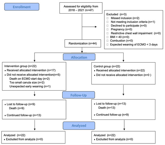 - Schmidt, M.; Pham, T.; Arcadipane, A.; Agerstrand, C.; Ohshimo, S.; Pellegrino, V.; Vuylsteke, A.; Guervilly, C.; McGuinness, S.; Pierard, S.; et al. Mechanical Ventilation Management during Extracorporeal Membrane Oxygenation for Acute Respiratory Distress Syndrome. An International Multicenter Prospective Cohort. Am. J. Respir. Crit. Care Med. 2019, 200, 1002–1012. [Google Scholar] [CrossRef]