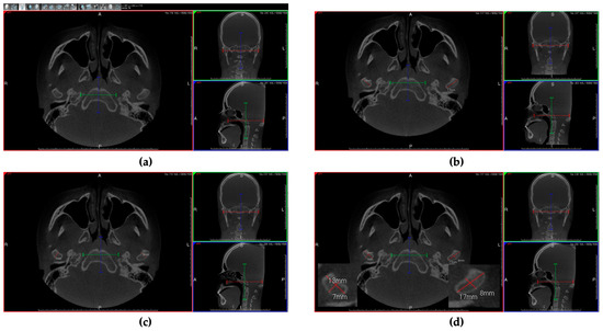 https://ct-dent.co.uk/i-cat-vision/2012/05/03 (accessed on 21 August 2024)), with consistent exposure parameters. Scans were set for 360° rotation, 300 image frames, 120 kVp, 5 mA, 3.7 s, voxel size of 0.4 mm, and a field of view (FOV) of 16 × 8 or 16 × 11 mm to minimize radiation exposure. The resulting CBCT scans were saved as DICOM files (Digital Imaging and Communications in Medicine).
