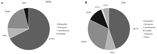 Etiology of diminished ovarian reserve (DOR) (A) and non-chromosomal premature ovarian failure (POI) (B). Patients with DOR showed slight differences in the etiology compared to non-chromosomal POI, with fewer autoimmune disorders and familial cases (p = 0.027). Iatrogenic causes included pelvic surgery, chemotherapy and/or radiotherapy for neoplastic disorders. Autoimmune origin was suspected in the case of at least one concomitant autoimmune condition.