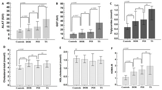 Hepatic and metabolic parameters ((A)—ALAT; (B)—GGT; (C)—Triglycerides; (D)—Total cholesterol, (E)—HDL-cholesterol, (F)—HOMA-IR) in the investigated women who had not been treated with hormone-replacement therapy. DOR-diminished ovarian reserve; POI–premature ovarian insufficiency (non-chromosomal); TS—Turner syndrome; NS—non significant.