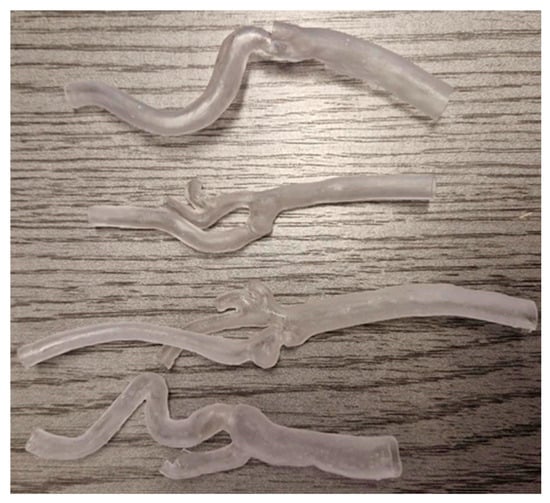 The geometries of the arteries were 3D-printed using Form 3B+ (Formlabs, Somerville, MA, USA). The BioMed Elastic 50A V1 resin (Formlabs, Somerville, MA, USA) can mimic mechanical properties and ensure biocompatibility. This resin is a translucent medical-grade material with elastic properties. Three-dimensional models were printed with 100 µm layer thickness, as recommended by the manufacturer. Build Platform 2 ensured biocompatibility because of the stainless-steel printed surface and quick-release technology. After 3D printing, the printouts were washed for 20 min in 99% isopropyl alcohol (IPA) using Form Wash (Formlabs, Somerville, MA, USA). The dried-out printouts were cured using a Form Cure L (Formlabs, Somerville, MA, USA). The printouts were placed in glass beakers and submerged in water during curing. The curing temperature was set to 70 °C for 30 min with Ultraviolet (UV) light and 5 min pre-heat without UV light. After curing, the supports were removed, and the remaining pieces were polished using Finishing Tools from Formlabs (Somerville, MA, USA). The obtained models are shown in Figure 1.