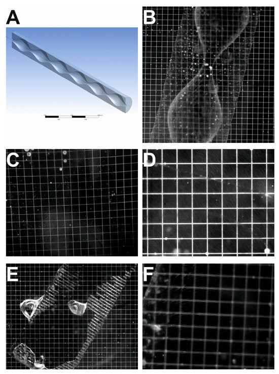 The densities and refractive indices of the printed blocks were also measured. The blocks were weighed, and the density was determined based on the measured volume. The refractive index was measured using an Abbe refractometer, and the comparative method involved selecting a solution with a refractive index at which there was no refraction of light at the liquid–solid interface. A typical direct measurement of a printed object using an Abbe refractometer provided a weak and blurred partition boundary. Refractive index matching was conducted using a 3D print with half of the multiple stenosis vessel model, with a 1 mm diameter for the stenosis and a 5 mm diameter at its widest point, as shown in Figure 2A. The testing geometry was used alongside a calibration plate with a 0.5 mm grid. The system with the glycerin solution, shown in Figure 2B, was used as an example of clear light refraction at the interface and to assess the print accuracy owing to the calibration plate. To determine the exact value of the refractive index (RI), a series of tests were performed for 12 liquids with different refractive indices in the range of 1.464–1.485. Figure 2C,E show a system in which light refraction is almost imperceptible, proving that the correct refractive index is close to the refractive index of these solutions. A dark contour in the shape of a single hourglass can barely be seen in Figure 2C, tilted slightly to the left, with small air bubbles on the top. The same shape tilted to the right with an air bubble during the narrowing of the geometry can be observed in Figure 2E because only the transverse strips contain air. Figure 2D shows the almost invisible edge of the bulge of geometry at the bottom of the image and a straight diagonal line on the top of the image, which represents the outer edge of the 3D print. Figure 2F shows deformation when the RI deviates approximately 0.01 from the correct value.