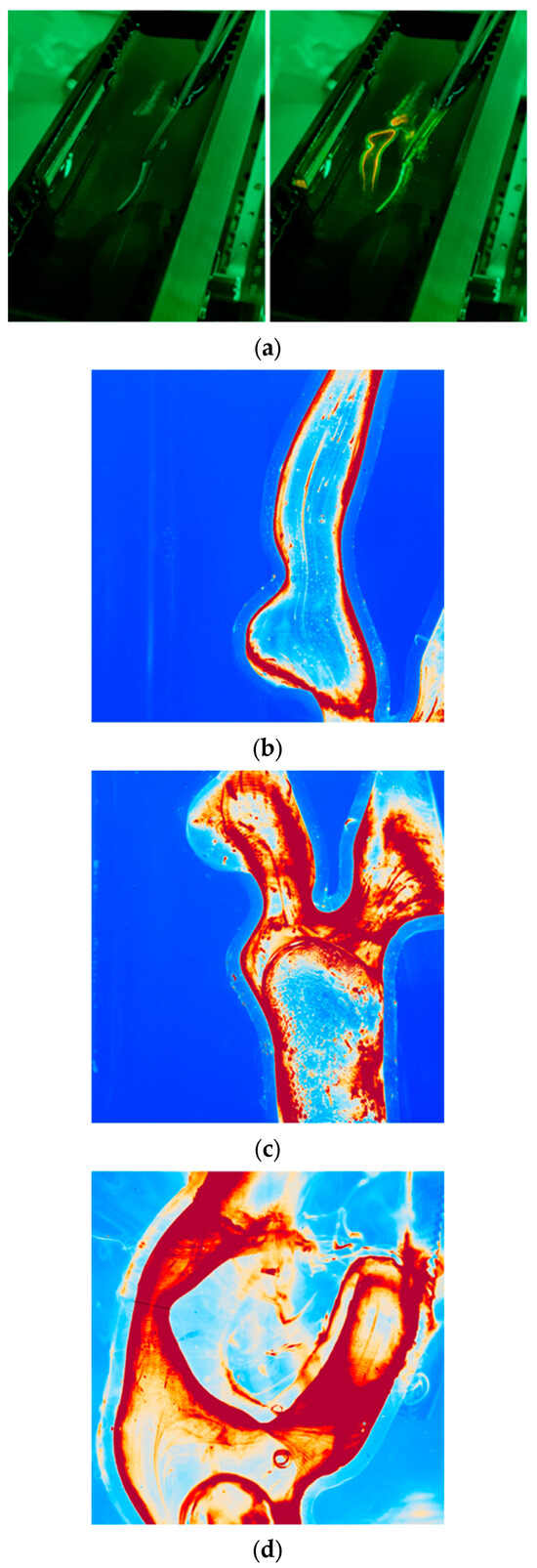 Obtaining the value of the refractive index allowed the development of a system for optical analysis of geometric dimensions. The system consisted of a cuboidal pool filled with glycerin and the geometry of an artery connected to internal spigots to which, on the other side, flexible tubing was connected to flood the system with a mixture of glycerin, water, and sodium iodide stabilized with sodium thiosulfate with the addition of rhodamine as a fluorescent dye. The selection of an appropriate refractive index ensured no light refraction, which made the geometry of the artery invisible, as shown in Figure 3a on the left. However, the inside of the artery was visible when the laser was operating, as shown on the right side of Figure 3a. The system consisted of a lens with a camera that recorded subsequent exposures. Figure 3b–d show images acquired by the camera from the same region as that in Figure 3a. The red colors originated from rhodamine deposition on the 3D-printed geometry inner walls induced by a 532 nm pulsed laser. The light blue halo represents the geometric walls.