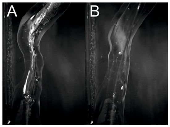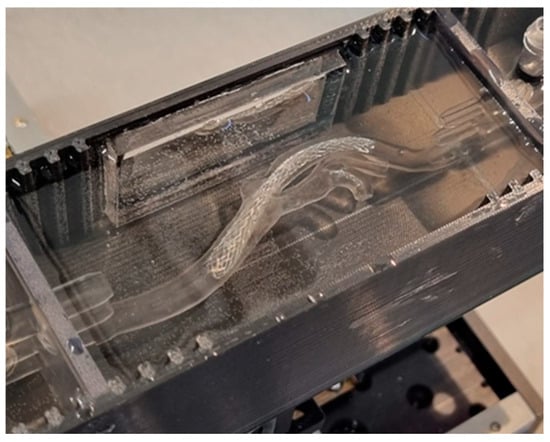 The print quality was assessed by comparing the dimensions of the desired model with those of the printed model. The diameter dimensions of the printed system in Figure 2A were 5.01 ± 0.04 mm and 0.97 ± 0.04 mm compared to 5.00 and 1.00 mm for the 3D model. The stenosis dimensions from Figure 3d were also compared, obtaining 2.25 ± 0.04 mm compared to the expected 2.20 mm. The obtained print accuracy was similar to that of a print using Clear V4 resin from Formlabs (Somerville, MA, USA) [], which does not have elastic properties.