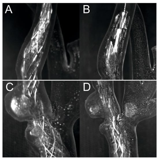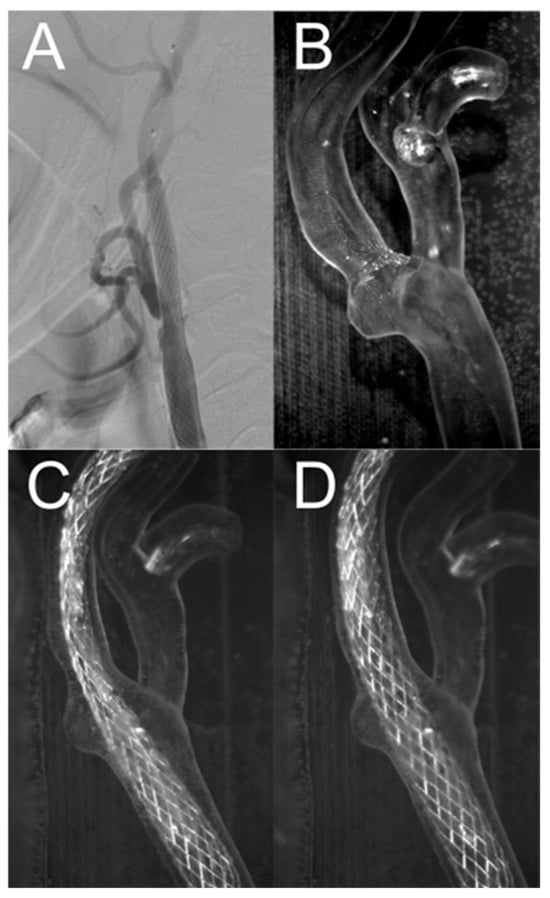Comparison of stents for two exposures, (A,C)—dense mesh (Roadsaver™—Carotid Artery Stent), (B,D)—sparse mesh (Protégé™ RX—Carotid Artery Stent).