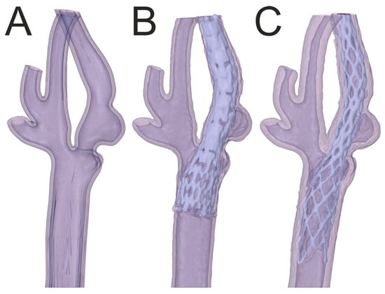 Comparison of CT images: (A) geometry without stent, (B) with Roadsaver™—Carotid Artery Stent, (C) with Protégé™ RX—Carotid Artery Stent.