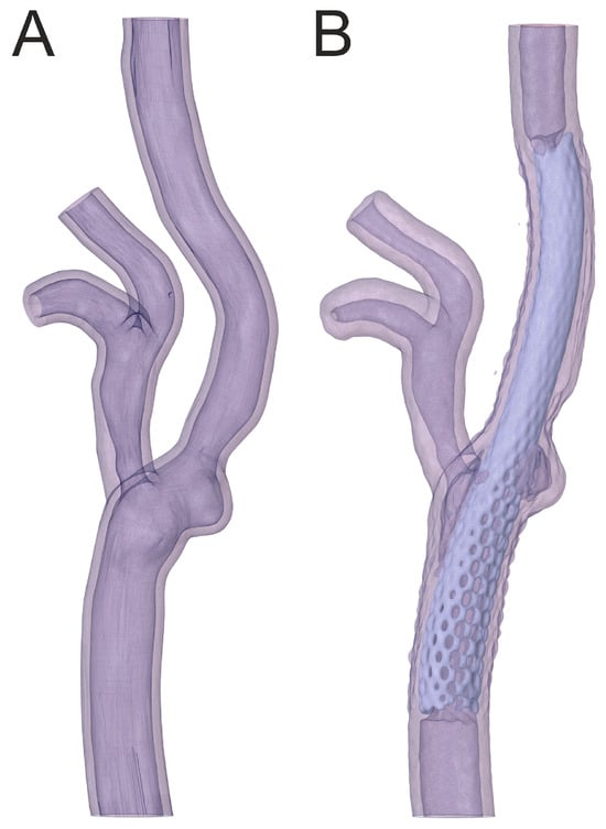 Comparison of CT images: (A) geometry without stent, (B) with Carotid WALLSTENT™.