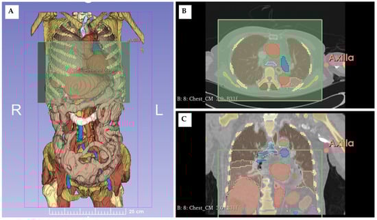 The patient’s axilla was defined as the initial skinfold observed in axial CT images when viewed from cephalad to caudal (Figure 2). Enhanced chest and abdominal CT scans were extracted and analyzed using 3D Slicer version 5.4.0 [16]. The Total Segmentator module in the 3D Slicer segmented each organ within the acquired PACS images (Figure 2) [16]. Segmentation data from chest and abdominal CT scans were merged using T12 (spine) as a reference point.
