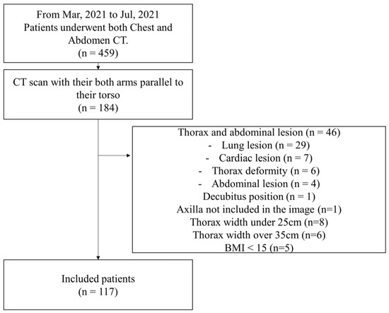 A flowchart illustrating patient selection is presented in Figure 3. Between March and July 2021, 459 hospitalized patients underwent both chest and abdominal CT scans with available height and weight data. Of these, 184 patients were imaged in the arms-down position. After excluding 46 patients with chest or abdominal lesions, 14 with thoracic widths outside the 25–35 cm range, five with BMI < 15 kg/m2, one in the decubitus position, and one without a visible axilla; data from 117 patients were analyzed.