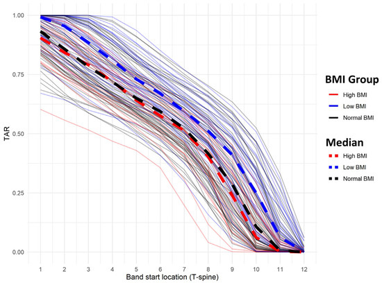 Figure 4 illustrates TAR changes based on LDB starting position across BMI groups. Mixed-model analysis revealed a significant increase in TAR with higher LDB placement (p < 0.001). While no significant difference existed between the normal and high BMI groups, TAR differed significantly between the normal and low BMI groups (p = 0.0113). The interaction between the BMI group and band location did not significantly influence TAR trends (BMI [low vs. normal) × band location, p = 0.62; BMI [high vs. normal] × band location, p = 0.78).