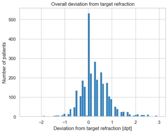 The overall mean deviation from target refraction was −0.3936 dpt, indicating a tendency for slightly myopic outcomes in the study population. The distribution of the deviation from target refraction is illustrated in Figure 2.