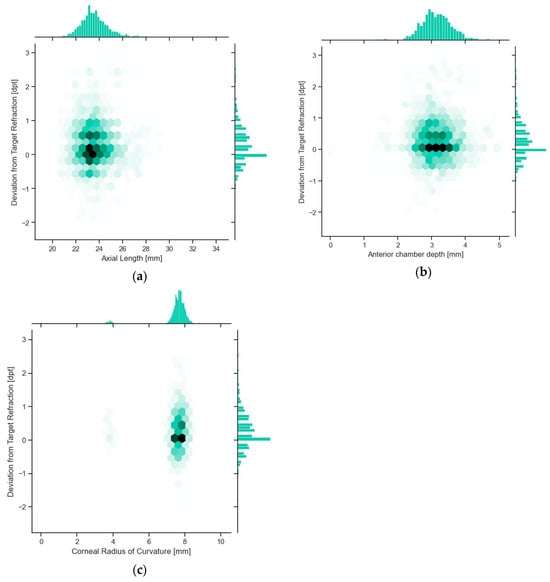 Influence of deviation from target refraction for different biometric parameters. The overall distribution follows the distribution of the three major biometric components. (a) Influence of the axial length on the postoperative deviation from target refraction as well as the distribution of the axial length of our patient cohort. (b) Influence of the anterior chamber depth on the deviation from target refraction. (c) Mean corneal curvature (radius) and the influence on deviation from target refraction.