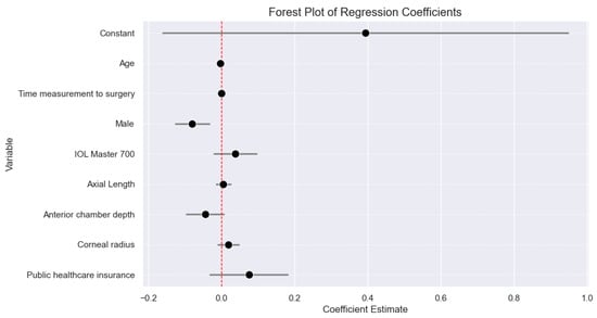The multiple linear regression analysis revealed that the constant term, age, and gender were statistically significant predictors of the deviation from target refraction. The constant term had a coefficient of −0.3936 (p = 0.164). Age showed a statistically significant association, with a coefficient of −0.0036 (p = 0.006), suggesting that increasing age was associated with a slightly more hyperopic outcome. Gender was also a significant predictor, with males having a significantly more hyperopic outcome compared to females, as indicated by a coefficient of −0.079 (p = 0.001). The other independent variables, including time elapsed between biometry and surgery, IOL Master version, and insurance status, did not show statistically significant associations with the deviation from target refraction. We also examined the biometric influences on the deviation from target refraction with our multiple linear regression analysis to quantify any potential impacts of the main biometric parameters on deviations from target refraction. The results, detailed in Figure 3 indicate no significant influence of these parameters on refractive outcomes. Specifically, the anterior chamber depth showed a small effect (coefficient: −0.005, p-value: 0.623), but this was not statistically significant. Axial length (coefficient: 0.045, p-value: 0.088) and corneal radius (coefficient: −0.045, p-value: 0.019) did not show a significant effect. The detailed results can be found in Table 2. The resulting forest plot can be found in Figure 4.