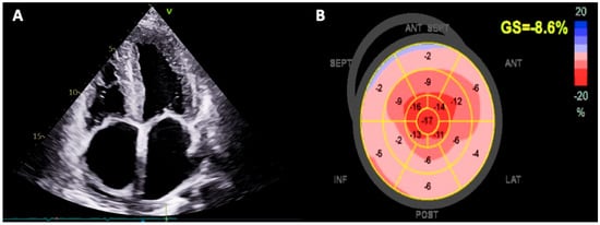 In addition, the echocardiographic assessment of global longitudinal strain (GLS) by speckle tracking analysis allows to identify the apical sparing pattern as a distinctive sign of cardiac amyloidosis. Indeed, GLS exhibits a global reduction, usually with the preservation of left ventricular ejection fraction until the latest stages of the disease, with a significant impairment of basal segment contractility and a relative conservation of the apical portions of the left ventricle (Figure 2B) [91].