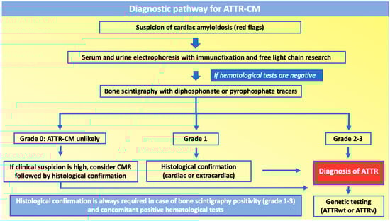 Diagnostic pathway of ATTR-CM. Abbreviations: ATTR-CM—amyloid transthyretin cardiomyopathy; CMR—cardiac magnetic resonance.