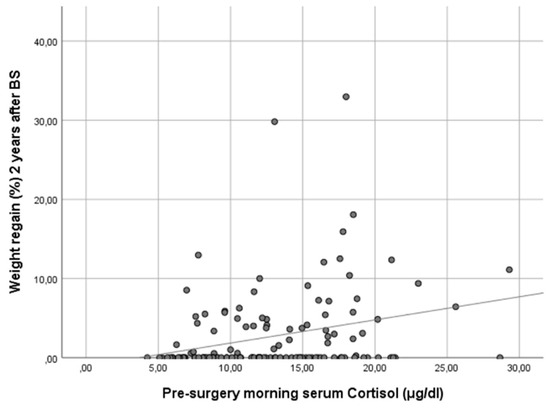 According to our results, none of the cortisol studies carried out before BS predicted weight loss, but an increased morning cortisol could warn of the tendency to regain weight. A pre-surgical morning serum cortisol > 13 μg/dL was predictive of a WR ≥ 10% at 2 years after BS and could be an easy tool to predict WR. Nevertheless, this finding requires confirmation using larger cohorts as well as a deeper investigation into the underlying mechanisms. Although our findings require validation, if confirmed, incorporating morning serum cortisol measurements into the holistic evaluation of pwSO could enable targeted stress-reduction interventions. Additionally, future research should explore the impact of stress-management strategies on cortisol levels and WR as well as compare cortisol variations across different weight loss approaches to better understand their influence on long-term outcomes.