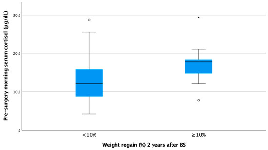 Boxplot of morning serum cortisol according to weight regain ≥ 10% at 24 months after bariatric surgery. Figure legend: Baseline cortisol was statistically significantly higher in subjects with WR ≥ 10% 24 months after BS (17.8 [IQR 13.1–18.5] vs. 12.0 [IQR 8.8–15.8]).