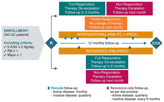 - Interventional arm: monthly monitoring during the active phase of the disease, and quarterly during remission. UC treatment optimisation (escalation/de-escalation) was performed by the investigator and triggered based on patient self monitoring of FC values and/or Patient Reported Outcome-2 (PRO2) scoring.