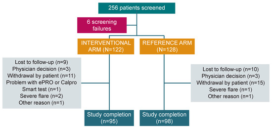 For the interventional arm, the investigator/designee provided the patient with CalproSmart™ FC Home tests (Calpro AS, Arnstein Arnebergs vei 30, 1366 Lysaker, Norway) to be used for the whole duration of the study, along with all the necessary instruction materials. One demo test was used to educate the patient during the baseline on-site visit. Study investigators also helped the patient register the CalproSmart™ application. The patients were then asked to perform the next test at home within the following 24 h to ensure that they remembered how to perform the test and to solidify their knowledge. Upon reception of a CalproSmart™ portal alert, investigators recorded the FC value in the patient medical record and in the electronic Case Report Form (eCRF). Subsequently, patients received alerts 7 days prior to each scheduled monthly/quarterly phone call to perform the FC home test. Patients performed the FC test (preferably in the morning) at home, and the results were automatically sent from the patient’s smartphone to the CalproSmart™ portal, from where it was viewed by the investigator/designee. Similarly, the patient received alerts 7 days prior to each scheduled monthly/quarterly phone call to complete their clinical symptoms (PRO-2) through the e-diary.
