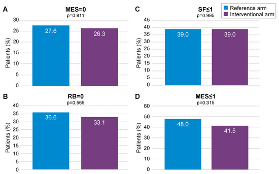 At 12 months, MES = 0 (primary outcome) was achieved by 26.3% of patients in the interventional arm and by 27.6% in the reference arm (p = 0.811; Figure 3A). Absence of RB was achieved by 33.1% of patients in the interventional arm versus 36.6% in the reference arm (p = 0.565; Figure 3B), whilst normal SF was reported at 39.0% in both arms (p = 0.995; Figure 3C). Endoscopic remission, defined as a MES ≤ 1, was achieved by 41.5% of patients in the interventional arm and 48.0% in the reference arm (p = 0.315; Figure 3D). In both arms, patients showed a similar level of improvement in their quality of life and reduction of work impairment through month 12 (Supplementary Figures S1 and S2). FC levels were found to decrease over time in the interventional arm (Supplementary Figure S3). The median number of FC dosages per patient was 7.5. Dose escalation was significantly more frequent in the interventional arm than in the reference arm (22.9% vs. 8.1%; p = 0.001). Combined steroid-free clinical and endoscopic remission (MES = 1, RB = 0 and SF ≤ 1) was achieved in 9.9% in the interventional arm compared to 5.6% in the reference arm (p = 0.405), whereas steroid-free clinical remission (RB = 0 and SF ≤ 1) was achieved in 22.9% in the interventional arm versus 25.2% in the reference arm (p = 0.763).