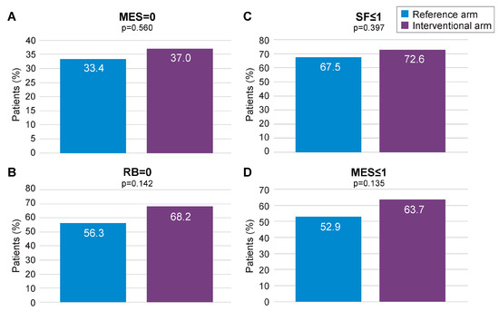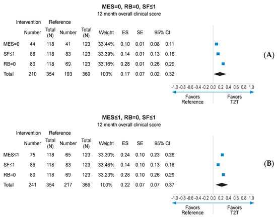 Missing data imputation with the MCMC method allowed to compare the outcomes of interest on the whole mITT population (118 in the interventional arm and 123 in the reference arm), with MCMC imputation providing 99 imputed datasets. Subsequent reanalysis of the primary endpoint (MES = 0) found a numerical advantage for the interventional arm over the reference arm (37.0% vs. 33.4%, respectively; Figure 4A). The secondary endpoints of RB = 0, SF ≤ 1, and MES ≤ 1 at 12 months also displayed numerical advantage for the interventional arm following MCMC imputation (Figure 4A–D). Logistic regression analysis pooling results for MES, SF, and RB at 12 months, using data derived from MCMC imputation, found a statistically significant advantage for the interventional arm over the reference arm (p < 0.001; Supplementary Figure S8). When combined in a fixed effects meta-analysis, the composite endpoint of MES = 0, RB = 0, and SF ≤ 1 at 12 months was achieved at a significantly higher rate in the interventional arm than the reference arm (ES: 0.17, 95% CI 0.02–0.32; p < 0.05; Figure 5A). A similar result was obtained for MES ≤ 1, RB = 0, and SF ≤ 1 at 12 months (ES: 0.22; 95% CI 0.07–0.37; p < 0.05; Figure 5B).