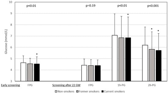 Plasma glucose values during hyperglycaemia in pregnancy screening according to smoking status. Data are shown as number ± deviation standard. Left panel: early screening (before 22 weeks of gestation (WG)), only fasting plasma glucose (FPG) value was measured (n = 5495). Right panel: after 22 WG, a 75 g oral glucose tolerance test (OGTT) was performed with measurement of FPG (n = 9588) and plasma glucose 1 h (1h-PG, n = 8716) and 2 h (2h-PG, n = 8879) after OGTT. Gestational age at early screening was similar in non-smokers, former smokers and current smokers: 12.3 ± 4.3 WG, 12.0 ± 4.3 WG, and 12.7 ± 4.5 WG, respectively (p = 0.15). Gestational age at OGTT was highest in smokers: non-smokers 27.7 ± 3.5 WG, former smokers 27.3 ± 3.3 WG, and smokers 28.2 ± 3.8 WG, p < 0.0001. WG: weeks of gestation. *: vs. non-smokers, symbol inserted only if significant (p < 0.05) after Dunnett adjustment for multiplicity.