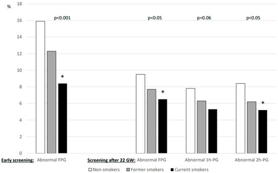 FPG levels during early screening for HIP, and 1h-PG and 2h-PG levels during OGTT after 22 WG, were lower in current smokers than in non-smokers in our study sample. This explains the lower prevalence of HIP in the former group. In women with HIP, defined according to the Carpenter–Coustan criteria, Aulinas et al. also found higher plasma glucose levels at 1 h and lower levels at 3 h after 100 g OGTT in smokers [25]. Elsewhere, Konstantakou et al. found similar patterns in women with and without HIP, specifically higher FPG and lower plasma glucose levels at 3 h after 100 g OGTT in current smokers [26]. These results for current smokers during pregnancy reflect data for current smokers outside pregnancy, specifically lower 2h-PG values than those of non-smokers [27]. Values for former smokers lay between those of current smokers and non-smokers, for both pregnant and non-pregnant populations [26,27]. On the contrary, Zaren et al. reported that 12.4% of mothers who were heavy smokers (i.e., ≥10 cigarettes a day) had a 2h-PG value > 8.5 mmol/L (i.e., the definition of HIP in that study), compared with 9.2% for light smokers and 6.0% for non-smokers [28]. However, in their study, the OGTT was performed late during pregnancy, at 37 WG, which could explain these different OGTT patterns [28].