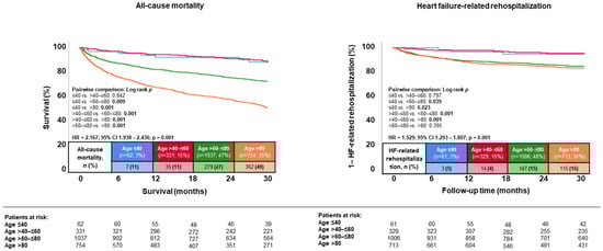 During a median follow-up of 30 months (IQR 12–54 months), the primary endpoint all-cause mortality occurred in 48.0% of patients >80 years, in 26.9% of patients >60 to ≤80, in 10.6% of patients >40 to ≤60 years, and in 11.3% of patients aged ≤40 years (p = 0.001) (Figure 2; left panel). Accordingly, patients >80 years of age had the highest risk of all-cause mortality at 30 months compared to younger patients (i.e., patients >60–≤80, >40–≤60, and ≤40) (HR = 2.167; 95% CI 1.928–2.436; p = 0.001). Even when stratified by decades of age, a higher age was associated with increased risk of all-cause mortality (HR = 1.620; 95% CI 1.510–1.737; p = 0.001; log rank p = 0.001) as well as HF-related rehospitalization (HR = 1.345; 95% CI 1.219–1.485; p = 0.001; log rank p = 0.001) in patients hospitalized with HFmrEF (Figure 3).