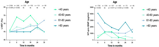 Changes in LVEF (left panel) and NT-proBNP levels (right panel) among patients stratified by age groups, during 30 months of follow-up. Data are presented as median and interquartile range (IQR).