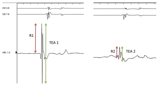 Representative example of bipolar R wave and total electrogram amplitude (TEA) measurements before (left) and after (right) RF application. OD, right atrium; ABL, ablator catheter signal.