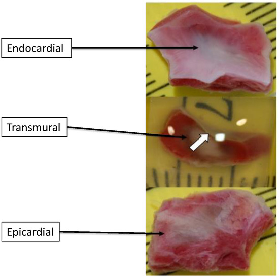 Representative example of excised RF lesion before PFA staining. White arrow: endocardium.
