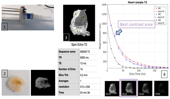 Given the small size of tissue samples, 1.5 to 3 Tesla MRIs were unable to achieve adequate histological accuracy. Therefore, we decided to perform MRI acquisitions with a 9.4 Tesla MRI at the Laboratoire Charles Coulon (Institute of Physics, CNRS and University of Montpellier). The MRI acquisitions were performed on post-mortem specimens after the heart samples were placed in a 10 mm diameter glass tube filled with Fluorinert FC-770 liquid (3M™ Electronic Liquids, Saint Paul, MA, USA) to keep specimens in good hydration conditions without interfering with MRI.