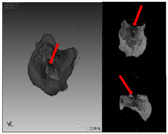 Representative example of a 3D acquisition of an RF lesion. Red arrow: endocardial side with the imprint of the RF catheter.