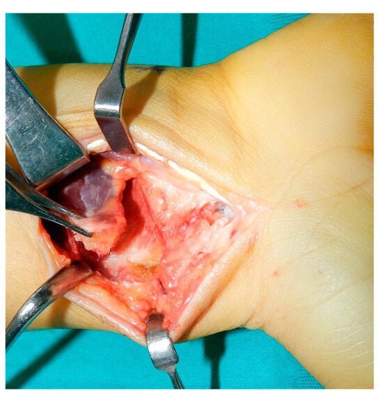 The most typical clinical sign of scaphoid nonunion is diminished wrist mobility [26], and one of the therapeutic goals is to increase the range of wrist motion. Research has suggested that an anterior approach for treating scaphoid nonunion results in the smallest loss of extension and flexion arcs [27]. However, other studies have shown that patients who undergo treatment with a PQPBG experience postoperative limitations in wrist motion, which are likely due to the muscle leash being sutured across the joint [28]. In our study, although flexion, ulnar, and radial deviations improved, we observed further postoperative limitations of restricted wrist extension, which contrasts with the findings reported by other studies [22,23,24] that reported postoperative improvements in all wrist movements, including extension. Limitations in one direction of motion and improvements in the other motions suggest that the limitation is not due to prolonged postoperative immobilization. We believe that the presence of the muscular leash crossing the joint volar and its possible shortening and stiffening over time, as revealed by radiologic calcification (Figure 6), may be the cause of this limitation.