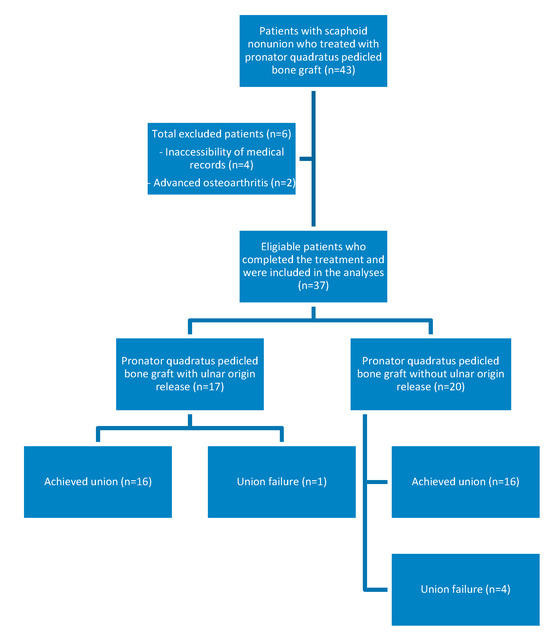 The PQPBG graft technique was performed for 43 patients with scaphoid nonunion, but only 37 patients were eligible for study inclusion (inaccessibility of medical records for 4 patients and 2 patients who had advanced osteoarthritis) (Figure 5). Twenty-nine of the included patients were male, and eight were female. The mean age of the included patients was 24.4 ± 5 (20–39) years. The cause of the fracture was a fall on an outstretched hand in 17 patients, a traffic accident in 11 patients, and sport-related injury in 9 patients. The initial fracture was unrecognized in 12 patients and was treated with a short-arm cast in 25 patients. None of the patients had previously undergone surgical intervention for the initial fracture or nonunion. In total, 14 patients had scaphoid fractures located in the proximal waist (zone II), 16 in the waist (zone III), and 7 in the distal pole (zone V). The nonunion type was D1 (fibrous union) in 7 patients, D2 (pseudoarthrosis) in 7 patients, D3 (sclerotic nonunion) in 8 patients, and D4 (avascular necrosis) in 15 patients. The mean time from initial injury to surgery was 16 ± 5.7 (8–26) months and the mean follow-up period was 15.5 ± 5 (9.5–24) months.