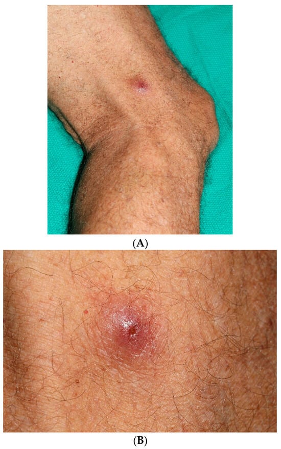 A 69-year-old male presented to the Division of Plastic Surgery of Mayo Clinic in Jacksonville, Florida, as per referral by his primary care provider for discomfort in the lateral side of his right knee. The patient reported a raised, irritated skin area, which he believed was caused by an insect bite. The lesion had serosanguinous drainage without pus. Despite the skin manifestation, he was asymptomatic and denied any similar lesions in the past. He also denied experiencing fevers, chills, fatigue, or any other symptoms besides skin irritation. He was treating it with Neosporin and triple antibiotic ointment.