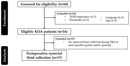 In summary, and as reported previously [], subjects were recruited between March 2013 and January 2015. Seventeen patients (≥50 years) diagnosed with KOA, according to the American College of Rheumatology criteria [], were eligible (Figure 1). These patients had invalidating symptoms of KOA and failed to respond to conservative treatment for at least three months. They were scheduled for a TKA by two orthopedic surgeons after informed consent. Patients with prior use of transcutaneous electrical neurostimulation (TENS), contraindications for TENS, or proficiency with a TENS device were excluded, along with those who did not have proficiency in Dutch or French. Prior to enrollment, all participants provided informed consent.
