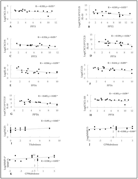 Bivariate associations between intra-articular biomarker levels and pain sensitization parameters. (A) Bivariate association between PPT1 and Log(CXCL-10). (B) Bivariate association between PPT2 and the predictor for acute inflammation. (C) Bivariate association between PPT3 and the predictor for chronic inflammation. (D) Bivariate association between PPT4 and the predictor for acute inflammation. (E) Bivariate association between PPT6 and Log(IL-8). (F) Bivariate association between PPT6 and Log(CCL2). (G) Bivariate association between PPT6 and acute inflammation. (H) Bivariate association between PPT8 and Log(CXCL-10). (I) Bivariate association between TSabsknee and Log(NGF). (J) Bivariate association between CPMabsknee and Log(MMP-7). (K) Bivariate association between CPMabsknee and the predictor for cartilage degeneration. * p < 0.05; R = Pearson correlation coefficient; PPT: pressure pain threshold; TS: temporal summation; abs: absolute; CPM: conditioned pain modulation; IL: interleukin; NGF: nerve growth factor; CCL: C-C motif ligand; CXCL: C-X-C motif ligand; MMP: matrix metalloproteinase.