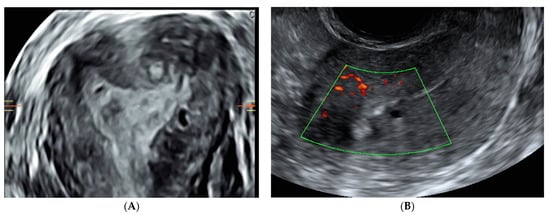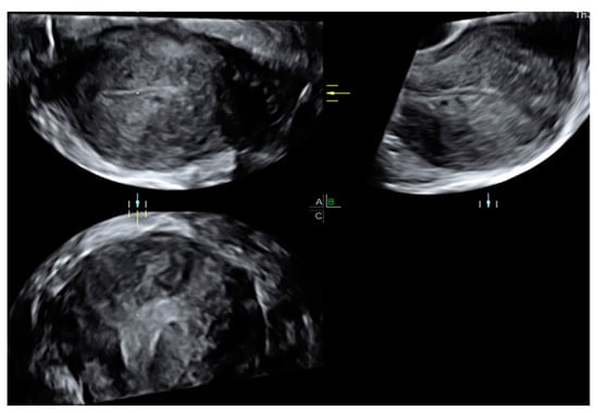 In addition, recently, an ultrasound sign concerning the uterus called “question sign” has been reported in the literature [27,28]. This is described when the body of the uterus is flexed backward, the fundus is bent posteriorly, and the cervix is directed frontally toward the bladder body (Figure 1). Power Doppler can be used to distinguish myometrial cysts from blood vessels and to discriminate between leiomyoma and focal adenomyosis. Uterine leiomyomas manifest circular flow along their capsules, while adenomyosis and localized adenomyomas are characterized by diffuse vessels within the lesions. Although the JZ can be visualized in a 2D image, the acquisition of a 3D volume allows for a more complete evaluation of the sagittal, transverse, and coronal planes, as shown in a standardized multiplanar view (Figure 2) [24,29,30].