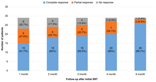 At 6 months post-SRT, 26 eyes (89.7%) showed complete SRF resolution, 2 eyes (6.9%) showed a partial response, and 1 eye (3.4%) showed no response (Figure 2).