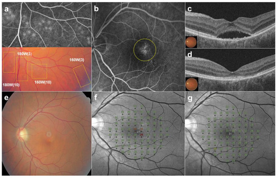 A 52-year-old male patient presented with a 9-month history of subretinal fluid (SRF) in the left eye. (a) Twenty test spots (yellow boxes) were observed at 1 h after irradiation on color fundus photography (CFP). While test spots (160 and 180 W) delivered with 10 micropulses were ”barely visible”, other test spots produced with 3 micropulses were invisible on CFP. All test spots showed leakages on fundus fluorescein angiography (FFA). (b) Thirty-nine SRT spots (160 W) with one-spot spacing, produced with three micropulses, were applied at diffuse leakages (yellow circle) on FFA. (c) SRF was seen on optical coherence tomography (OCT) at baseline (d). SRF was resolved completely on OCT at 6 months post-SRT. (e) No SRT spots were visible on CFP at 6 months post-SRT. (f) The mean deviation (MD) of microperimetry improved from −0.45 dB at baseline to −0.10 dB (g) at 6 months after SRT. No scotomatous change was observed in the SRT-treated area on microperimetry.