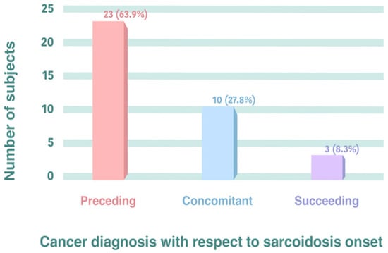 Only two subjects with sarcoidosis and cancer showed metastasis, and one of them was affected by lymphoma. Regarding the timing of cancer and sarcoidosis onset, 63.9% of the subjects in the present study showed cancer preceding the sarcoidosis diagnosis, while 27.8% showed sarcoidosis and cancer during the same period (concomitant), and only 8.3% showed cancer after the sarcoidosis diagnosis (Figure 1).