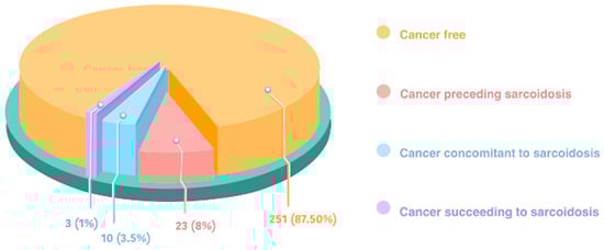 Percentage of subjects with and without cancer in the total sarcoidosis population (287 subjects). The temporal relationship between cancer and sarcoidosis onset is indicated in the cancer populations.